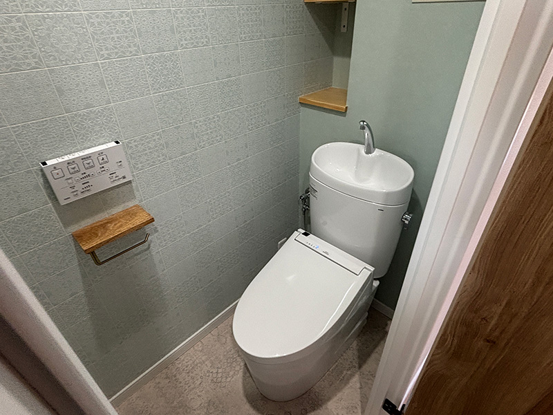 ブルーグリーン系の壁紙の爽やかなトイレ